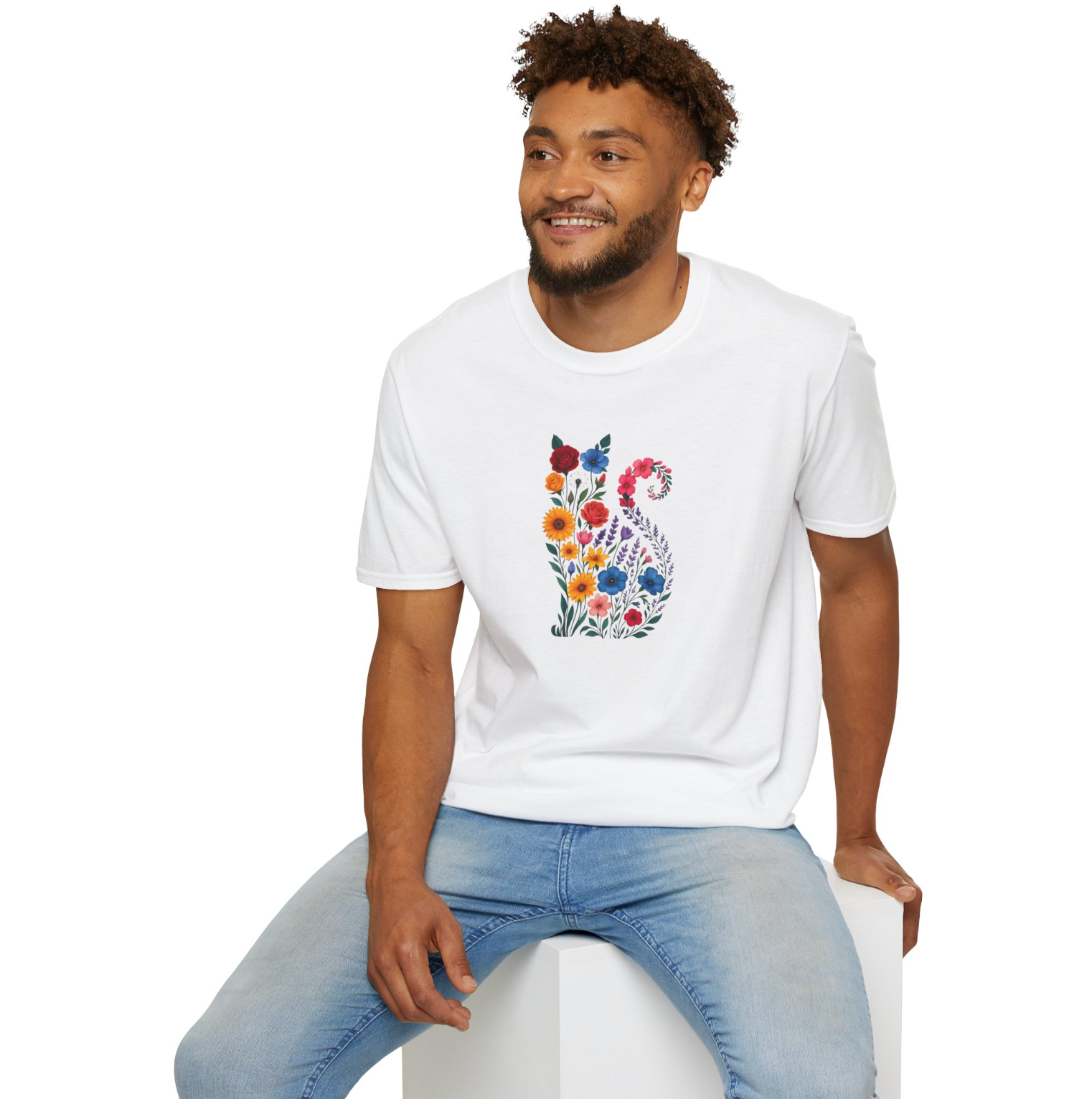Rengarenk çiçeklerle tasarlanmış kedi silüeti baskısı, bu beyaz unisex tişörtü benzersiz kılıyor. Hem şık hem de rahat olan bu parça, günlük kombinlerin vazgeçilmezi olacak.